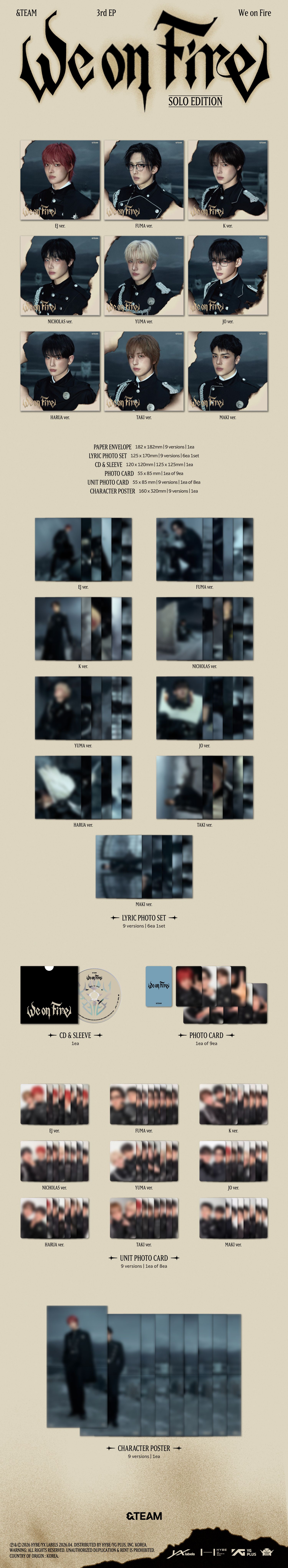 &TEAM releases their 3rd EP ‘We On Fire’! Available in a Solo Ver., specific to each member. Contents of the album include: CD, Sleeve, Paper Envelope, Lyric Photo Set (6ea per set), Character Poster, Photocard (1 of 9), Unit Photocard (1 of 8). Dimensions: 182 x 182 x 5 mm.